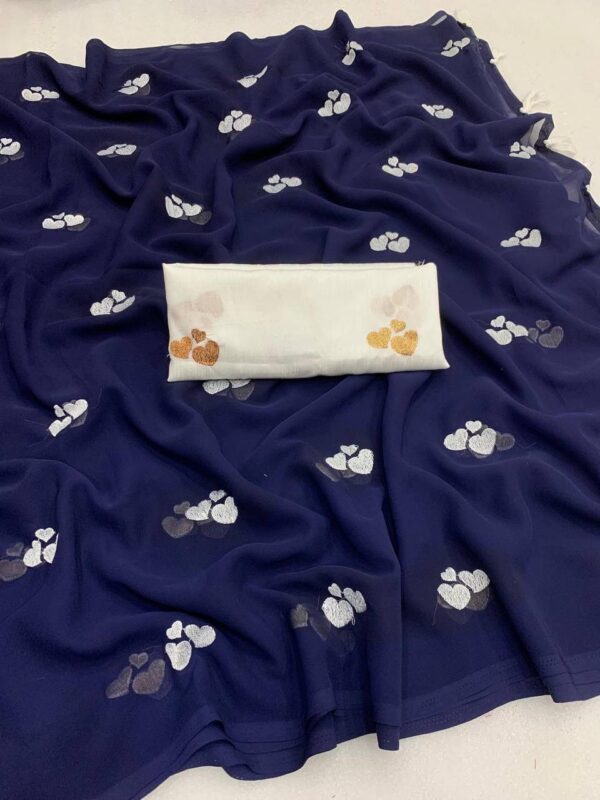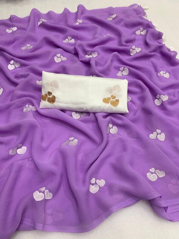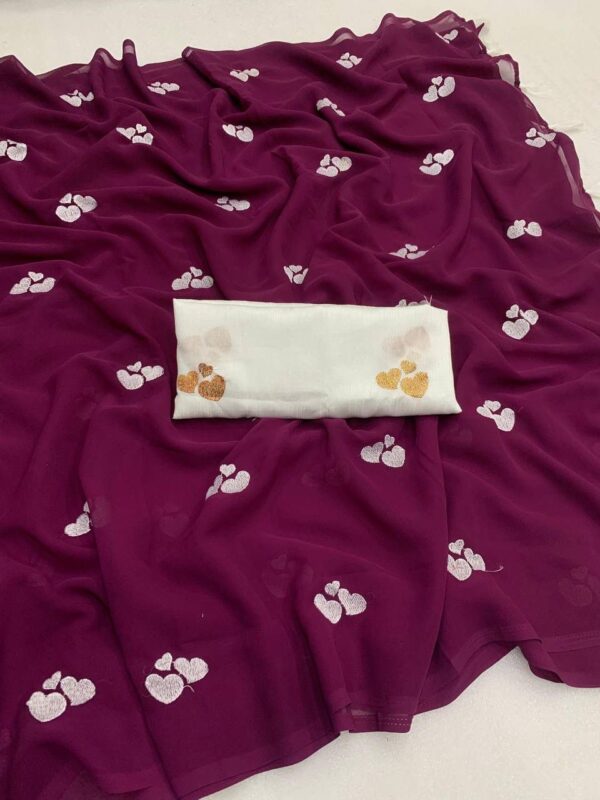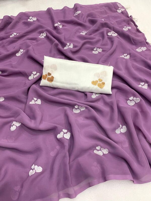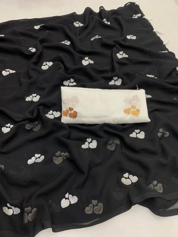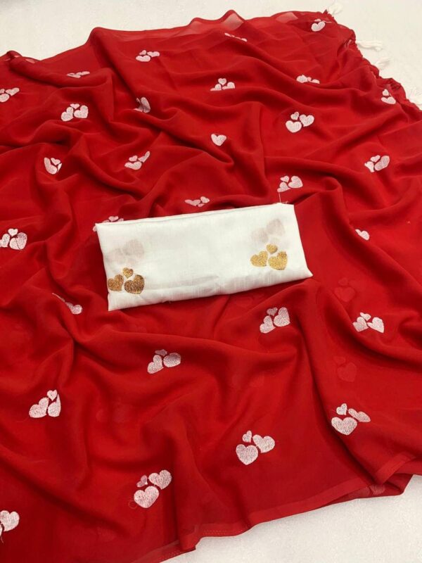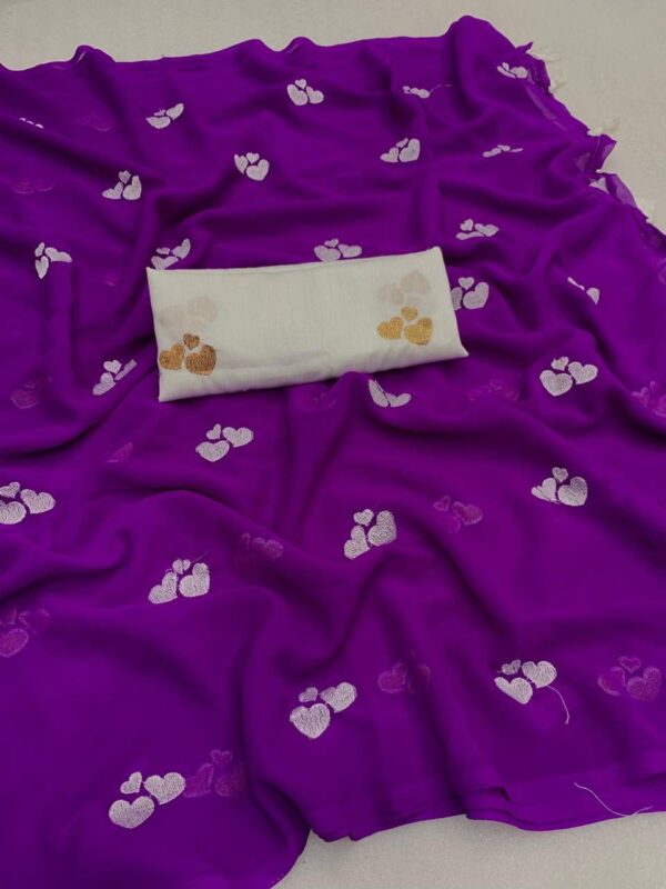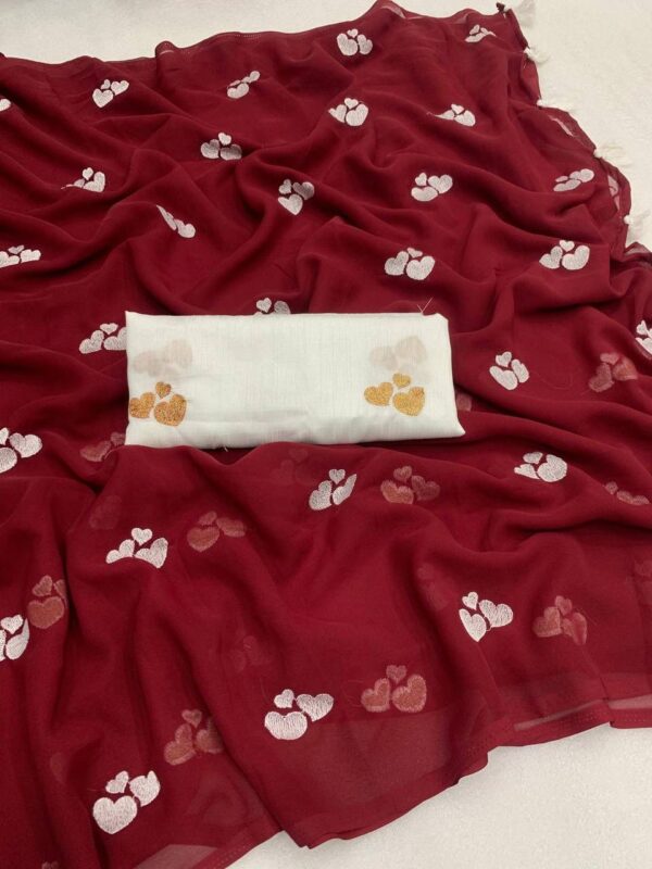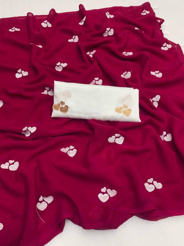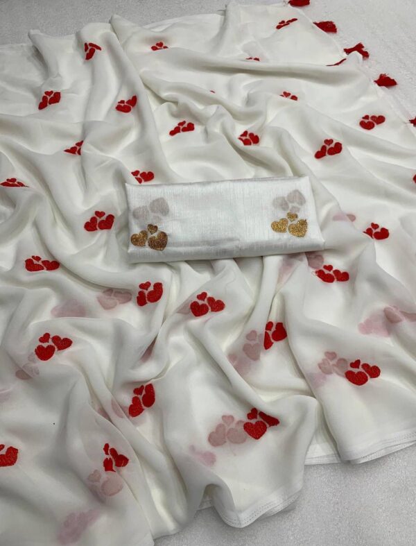 – Design: This beautiful saree features delicate embroidery of little heart, adding a graceful and vibrant touch to your ensemble.