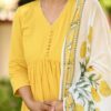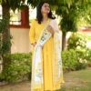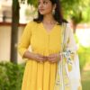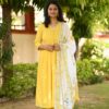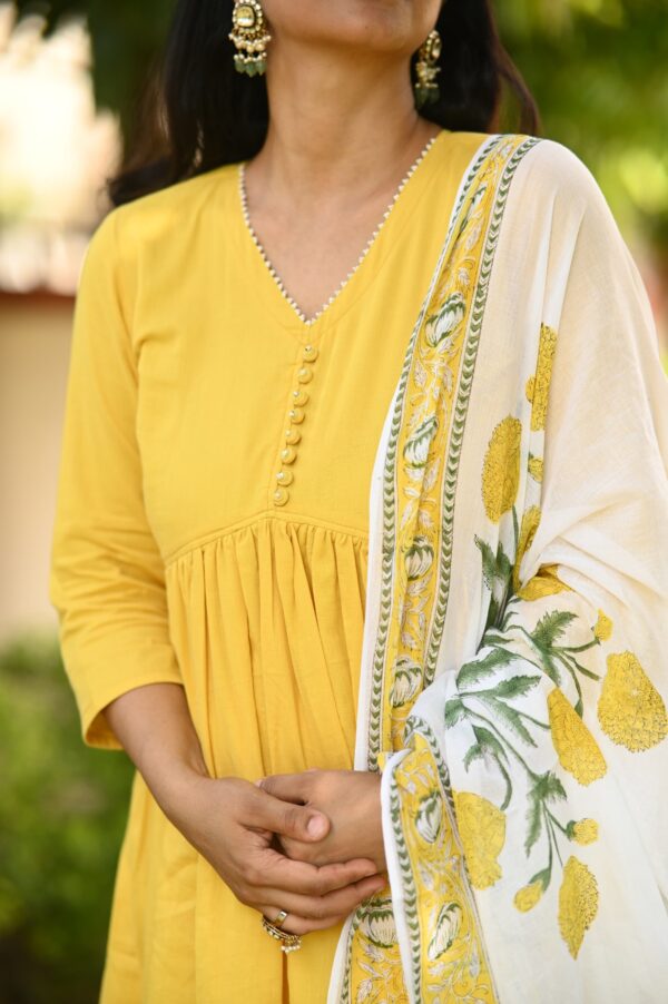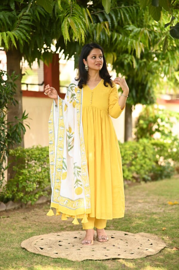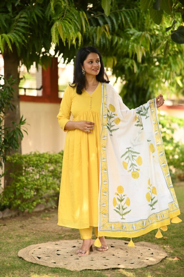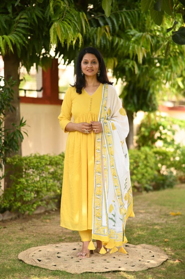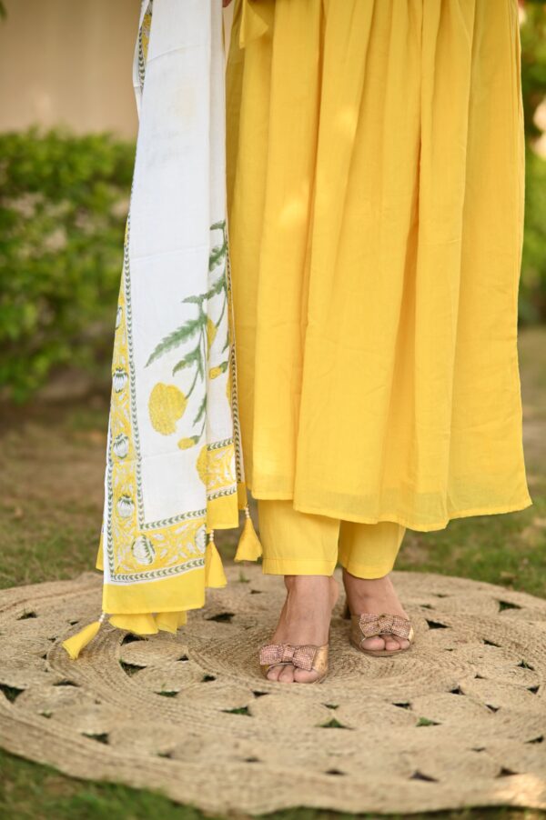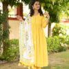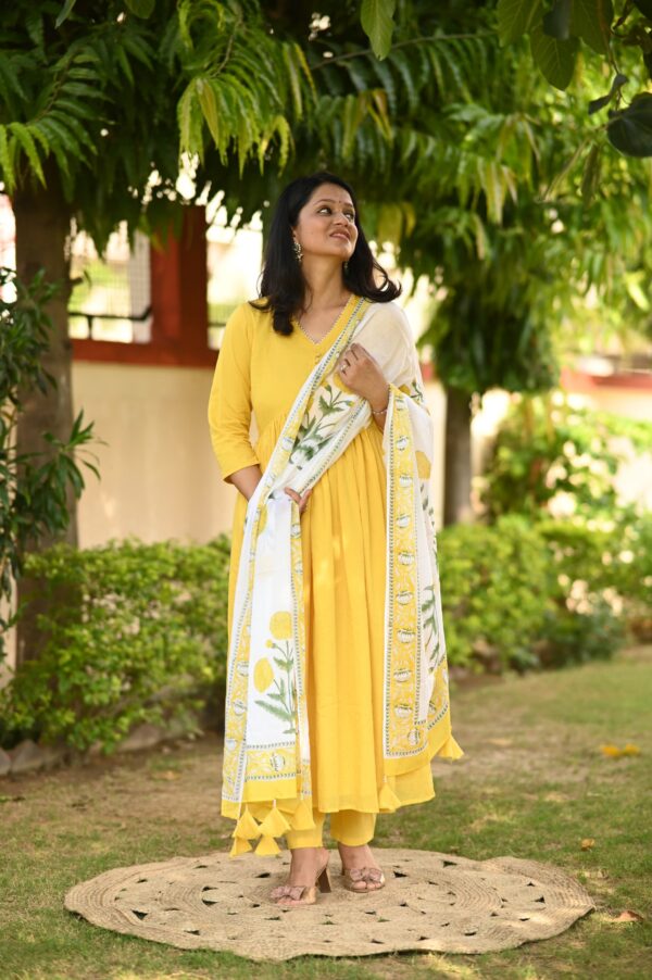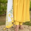 Indulge in luxury with our yellow Alia style suit set. This elegantly designed set features delicate pearl hand work and a unique pearl tassels hand block dupatta. Creating a look that is both sophisticated and exclusive.