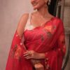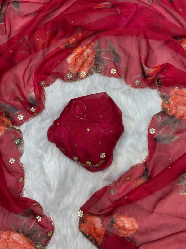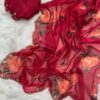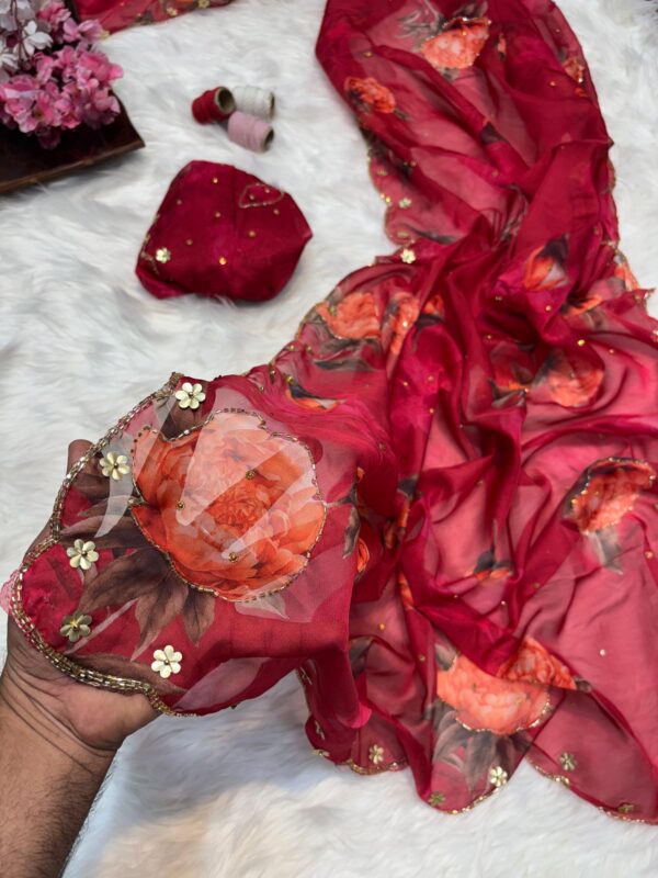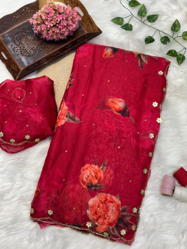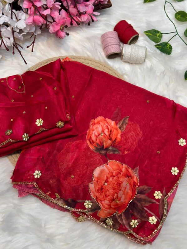 Pure soft teby silk saree with beautiful digital prints flower and hand cut dana work heavy outing border in all over saree , Paired with digital fabric with khatli sleeves pattern blouse