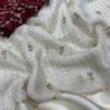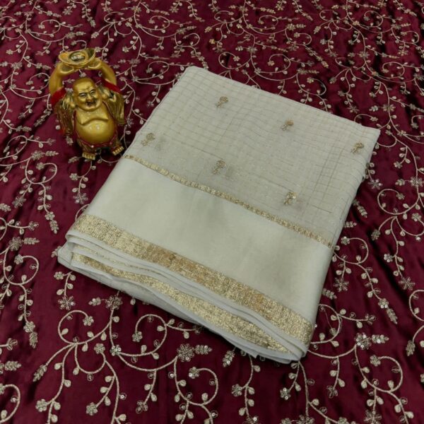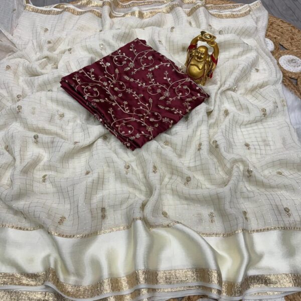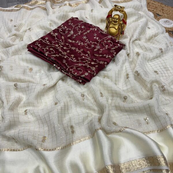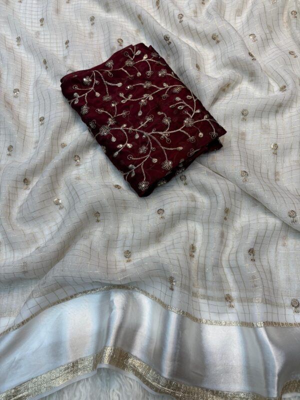 FABRIC : Pure viscose georgette with trending weaving Chex border satin with beautiful sequence worked butti with contrast rangoli silk and heavy embroidered blouse